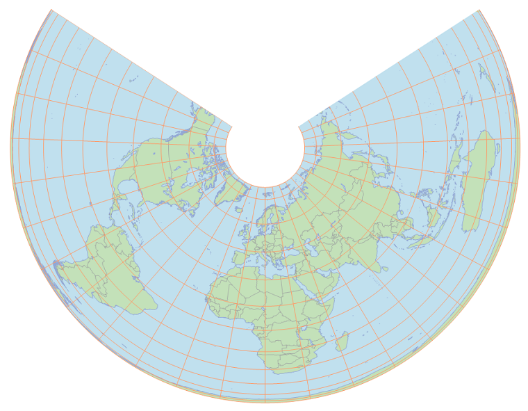 This map projection, presented by Heinrich Christian Albers in 1805, is equal-area, and has true scale on its two standard parallels. Between the standard parallels, features appear too tall and narrow. Outside the standard parallels, features appear too short and fat. (Small features near a standard parallel nearly keep their true shape.)
