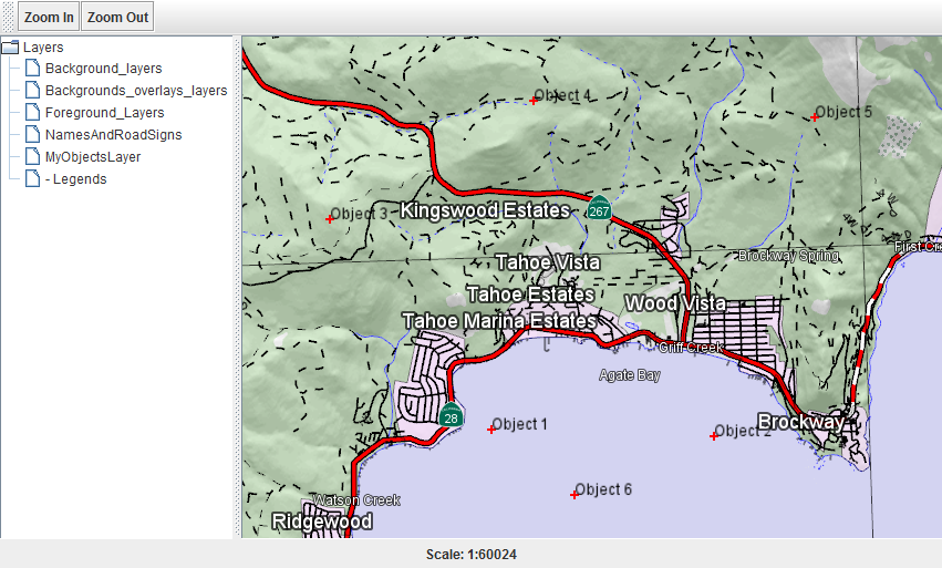 This sample shows an application with a geographic background and an application data layer. It also shows how to implement panning and zooming using the tools provided in Carmenta Engine, as well as a simple layer control.