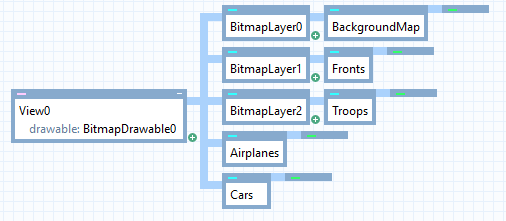 A BitmapLayer makes its sub-layers draw themselves on a bitmap, and then copies the bitmap to the drawable connected to the view. The bitmap will only be regenerated when the visible area changes or an application explicitly flushes the cached bitmap. This makes it efficient to use a BitmapLayer for the background layers that seldom change. When the view is panned, the part of the bitmap that is still visible can be reused, which makes small pans very efficient.