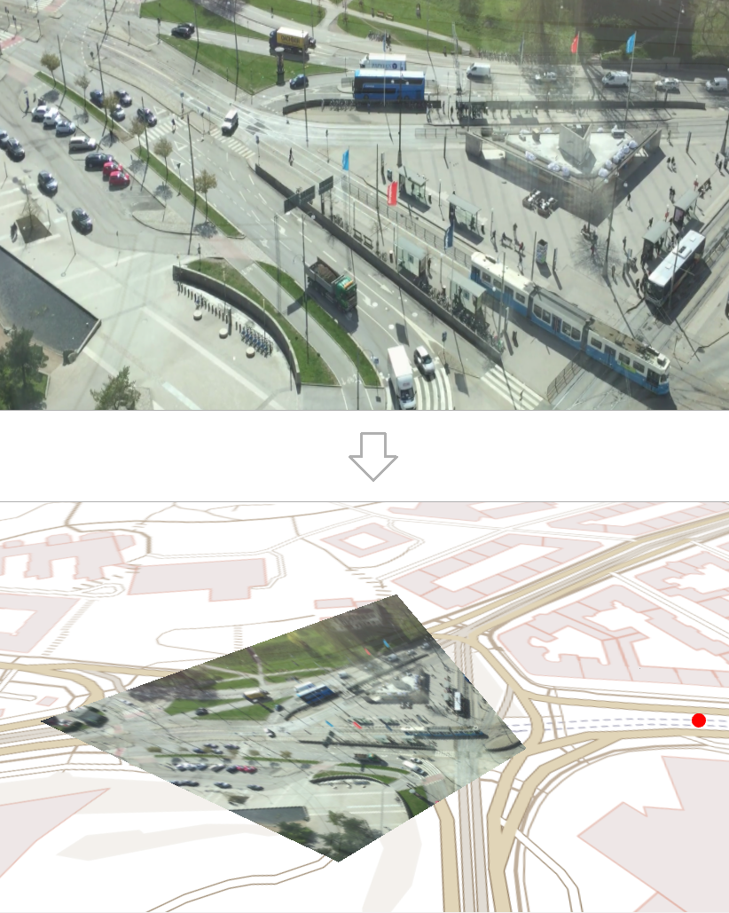 A CameraProjectOverlay takes a feature representing a photograph or video frame that is not orthorectified, and uses special attributes from the feature to georeference it.