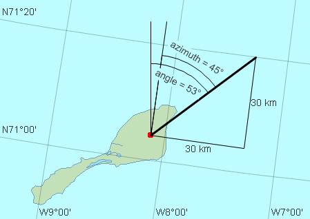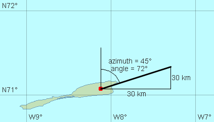 For non-conformal projections, the difference between azimuth and angle is usually not constant at a point. For example, if the projection is a regular cylindrical one (like Projection.LongLat or MillerCylindricalProjection), north is always up and east is always right (so that the returned angle will equal the azimuth if azimuth is 0°, 90°, 180° or 270°). However, northeast (azimuth 45°) is not always angle 45° from up: in LongLat, the west-east scale at Jan Mayen is 3 times larger than the north-south one, which causes azimuth = 45° to correspond to angle = 72°. See picture below.