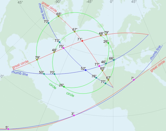 Two lines are given, each with exactly two points, together with their types (GreatCircle or RhumbLine). The returned list of points will contain the points where the lines intersect. If the lines are of the same type, they can intersect at most once. However, a great circle can intersect a rhumb line up to three times (even if the segments are short); see the map below.