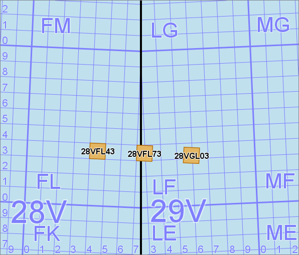 The image above shows the boundary between UTM zones 28 and 29 inside latitude band V, and we see that the 100 km square 28VFL is not completely inside the standard zone 28. We also see three example results from ParseMgrsAsArea: