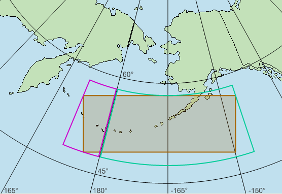 In the example above, the map uses a Crs based on a LambertConformalConicProjection projection, with a central longitude at -165°. The brown rectangle, which is defined in the same Crs, crosses the international date line without problems, since the Crs has no discontinuity there. However, when the brown rectangle is reprojected to a Crs based on LongLat, it is impossible to give the result as a single LongLat rectangle with normalized longitudes. The southwest corner would need a longitude around 172°, and the northeast corner would need a longitude around -146°, but since 172 is greater than -146, this would not be a well-formed rectangle. Instead, the result of ProjectTo will consist of two LongLat rectangles, which are shown in purple and green.