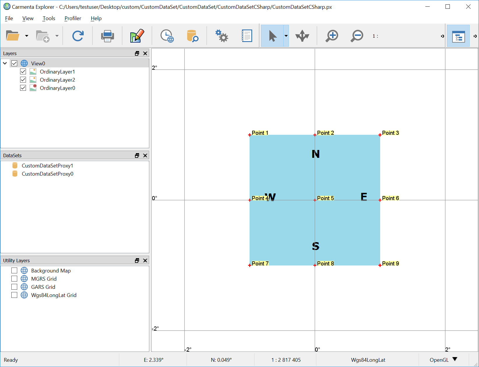 This sample provides two different custom datasets. The first contains point features that are read from a comma separated text file and the second is a custom raster dataset that loads a regular PNG image file and places it in a geographic rectangle.