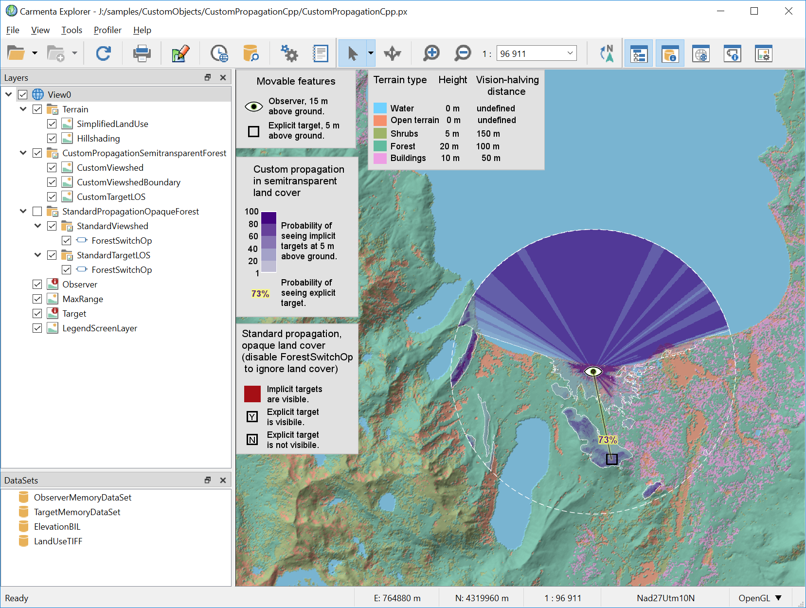 The sample implements a non-standard propagation model for line of sight with semitransparent land cover. The probability of seeing a target through land cover is assumed to decrease exponentially with distance in a way that is quantified by the probability-halving distance.