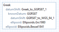 In Carmenta Engine, you cannot represent the concatenated form directly as a sequence of datum shifts. Instead, you must first implement the intermediate GGRS87 datum (using the Helmert datum shift "GGRS87 to WGS 84 (1)"). Then, you can use GGRS87 as the known datum for your implementation of the LongLatOffsetDatumShift "Greek to GGRS87 (1)".