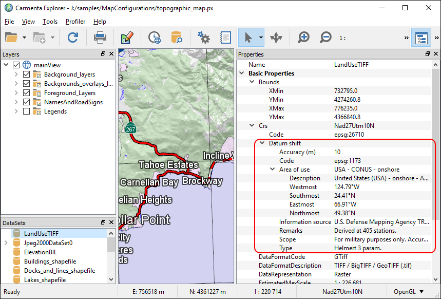 When you use Carmenta Explorer to display a dataset whose Crs is not based on WGS84, you can see information from the DatumShiftInfo in the Properties window when you have selected the dataset in the DataSets window.