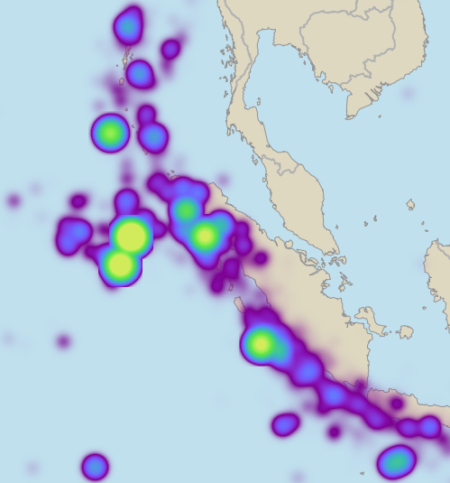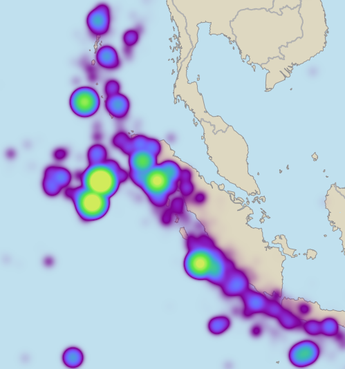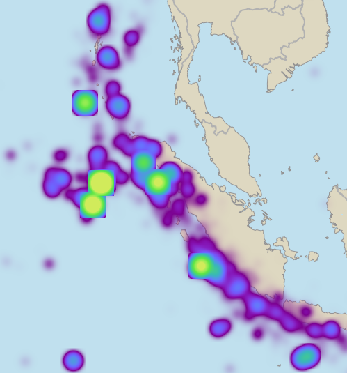 This map was generated from a database of earthquakes, and the DensityDataSet.FeatureWeight was not the magnitude but the released energy, which varies much more than the magnitude numbers. For the worst hotspots, the smoothed energy density at the cropping square boundary is very small compared to the center, but it is still not negligible compared to the neighboring areas.