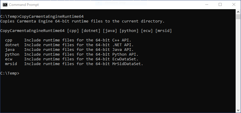 The Carmenta Engine SDK includes a small script CopyCarmentaEngineRuntime64 that can be used to copy the necessary Carmenta Engine runtime files for an XCOPY installation.