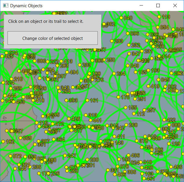 The objects are represented as regular features in a MemoryDataSet. But as the features are moved, they also leave a trail: each previous position is shown as a small dot, implemented as a plot in a PlotLayer. The plots are "aged" and fades away after a few seconds. Individual objects can be selected by clicking on their trail.