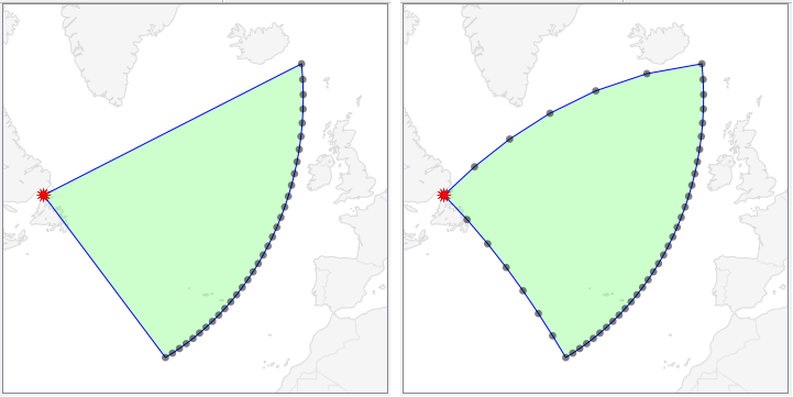 If a sector is generated instead of a full circle or ellipse, then the two radial edges could be long. If you need the radial edges to trace great-circle routes with high accuracy, you may need them segmented into shorter edges, since a long great-circle route will in general not appear as a straight line in the View.Crs. (Actually, a gnomonic map projection would display great-circle routes on a spherical Earth as straight lines, but the gnomonic has many drawbacks and is not supported by Carmenta.)