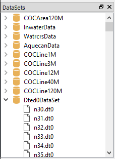 The DataSets window shows the datasets that exist in the map configuration. If there are several views the datasets will be shown under the View in which they belong. When you select a dataset in the list, the Properties panel will be filled with information regarding the selected dataset. Some datasets will generate sub items in which case there is different information to be found in the Properties panel depending on what is selected in the DataSets panel.