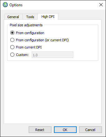 The default setting From configuration uses pixel size adjustments specified in the map configuration. From configuration (or current DPI) uses pixel size adjustments in the map configuration if any have been specified, otherwise it adjusts the visualization for the current DPI of the primary screen. From current DPI always adjustments and adjusts the visualization for the current DPI of the primary screen.