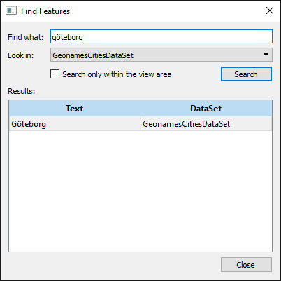 The text to search for is specified in the Find what field. Look in can be used to limit a search operation to a specific dataset. Search only within the view area limits the search to the current view area. You can zoom to a feature in the result by double clicking on it in the Results list or by selecting it the list and then pressing Enter.