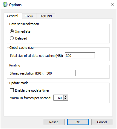 Options command opens a dialog for setting options for controlling data set initialization, the global cache size,