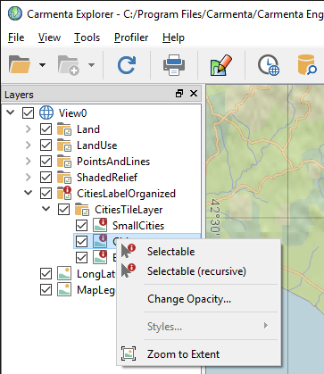 Right-clicking on a layer displays a layer specific context menu where you can toggle whether layers are selectable. You can also zoom to the area covered by data displayed by the layer.