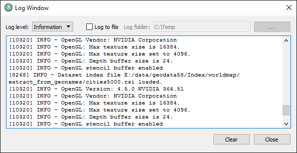 or selecting the Log window command in the View menu. The Log window shows log messages generated by