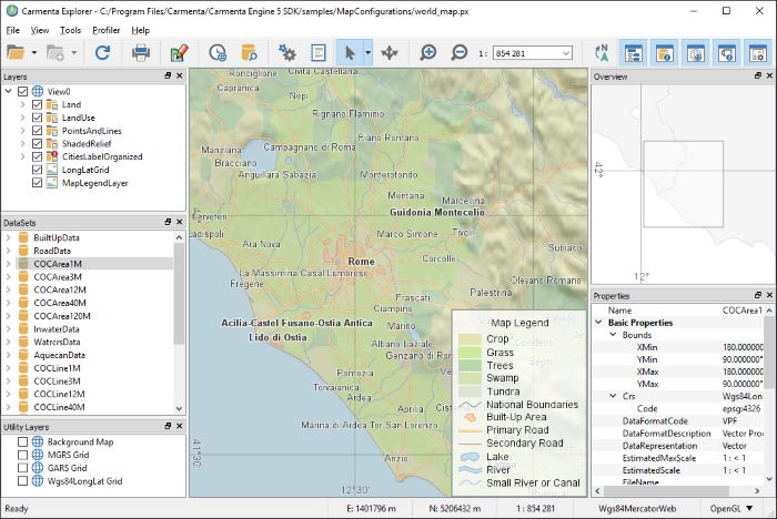 The Show Map Configuration Samples command opens up a browser from which you can explore and load the different map configuration samples included in the Carmenta Engine SDK installation. More information about the samples can be found in the documentation for map configurations samples.