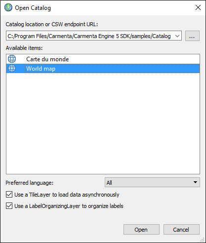 After entering the path to a local catalog on disk or the endpoint URL of a remote OGC CSW service the dialog will be populated with the list of available maps that you can open in Carmenta Explorer. This operation can take a while if you are connecting to a remote OGC CSW service.