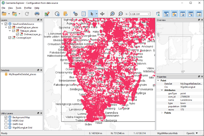 The main purpose of this function is to quickly find out what kind of geographic data the data source contains and what attributes it has. Visualization is created based on geometry type, and if certain attributes that are known to be text exist, a TextVisualizer will be created. The created map configuration can be saved and used as a starting point from which you can create your complete configuration. When saved, Carmenta Explorer will reload the map configuration as a .px file.