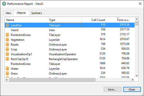 The root items in the report represent work performed by different threads. The first item always contains performance data collected for the GUI thread when it draws a map. Other root items, if any exist, contain performance data collected for the work that each TileLayer or TileLayer3D instance performs on a background thread: loading data, processing it in operators and generating the visualization (but not drawing it).