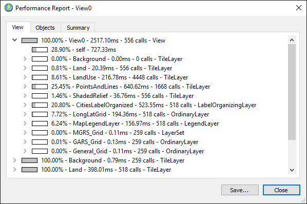 The Open Performance Report command is used to open and display a performance report that has been saved by either Carmenta Explorer or a Carmenta Engine application. You can also profile maps rendered by an application, see the documentation for the Profiler menu class for more information.