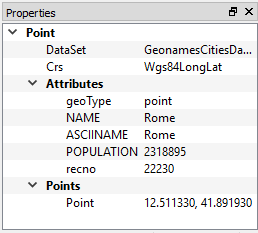 When you click on features in the map window they get selected and their geometry points and attributes are shown as text in the properties window.