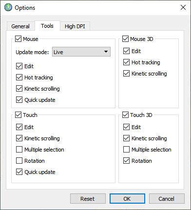 Options in the Standard tool section can be used to enable or disable specific interactions provided by the built-in standard tool. You can also disable the standard tool completely. There are separate settings for the combinations of mousetouch and 2D3D. The tools are: StandardTool, StandardTool3D, StandardTouchTool, and StandardTouchTool3D.