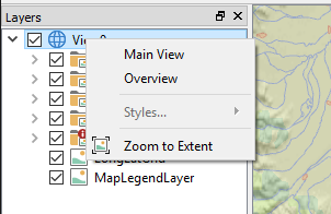 In the layer tree you can turn layers on or off by clicking the check boxes. You can also assign views to display in the main and overview windows by right-clicking the name and select from the context menu, see below: