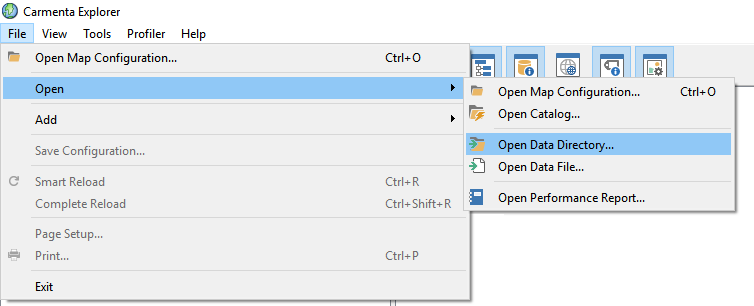 Open Data Directory... and select the folder containing the data. Carmenta Explorer will try to create a suitable map configuration to visualize the data. If you only want to add specific files, use