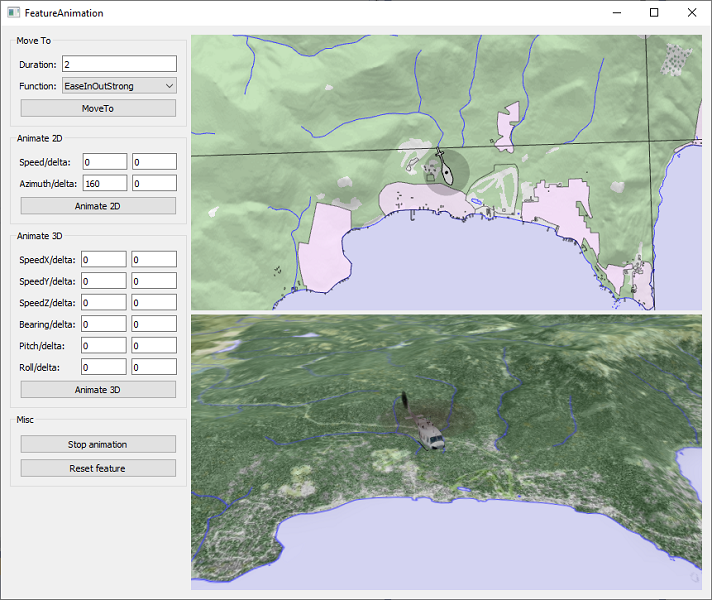 This sample, using C++ and Qt, shows a 2D and a 3D view with a single feature. A side panel can be used to activate different types of feature animations, while the effect of the animations can be seen immediately in the map views.