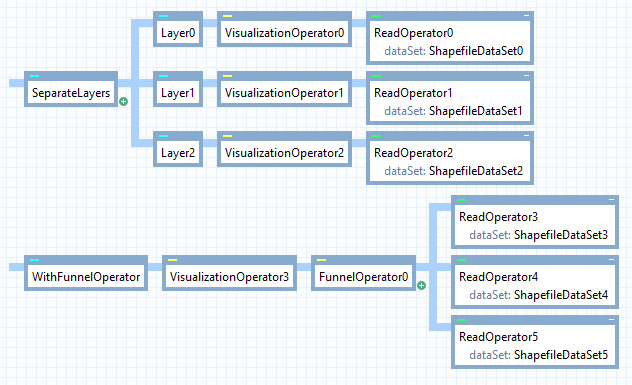 The figure below show two different ways to join different sources of data, one with three different layers grouped into a LayerSet, and one using a FunnelOperator that join the data flow into a single layer. Yet another way to group the data sources can be to use a DataSetSet. Which strategy to choose depends for example on the processing needs of the data.