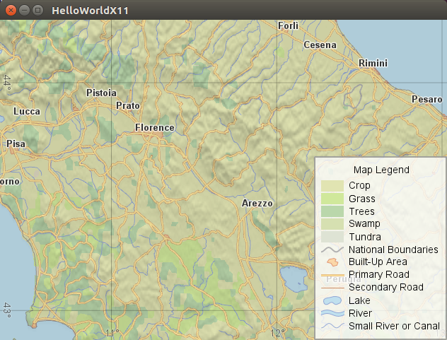 When started, the application will display a map window with a sample map configuration, with full pan and zoom functionality. By default a 2D sample configuration is loaded, but you can modify the sample to load another configuration file. The following screenshot shows the application running on Ubuntu Linux.