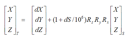 The point to the far right consists of geocentric coordinates X, Y, Z in S, a source geodetic datum. On the left hand side, the same point is expressed in T, a target geodetic datum. The dS is the value of scaleDifference (which is expressed in parts per million). And the matrices Rz, Ry, and Rx are rotation matrices specified by RotationZ, RotationY, and RotationX. The formula can of course be used to transform a point expressed in S to a point expressed in T; this is the forward direction. But the formula can also be used backwards.