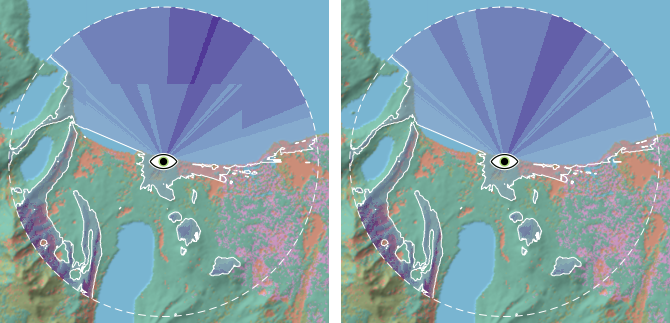 This matters because a LineOfSightOperator can compute a single result in multiple pyramidal resolutions (see VisibilityOperator.FirstResolutionChange), and the calling operator must know whether it must generate equidistant profiles for its calls to Propagate. Unfortunately, when equidistant profiles are demanded, a multi-resolution result may have annoying visual artifacts. They can occur because the operator cannot generate a single profile through multiple resolutions for each ray. Instead, the operator must first generate a short terrain profile in the finest resolution near the observer, and then a longer profile for the second finest resolution where the profile points near the observer have been downsampled, etc., and the downsampling can cause discontinuities at the resolution boundaries. Both screenshots below were generated by the sample in samples/CustomObjects which is configured to use two resolutions: 10 meters near the observer and 20 meters farther away. But in the left screnshot, the custom object was modified to demand equidistant profiles.
