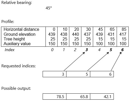 The third parameter is the collection of requested indices, which can improve performance since the calling operator will usually not need propagated values for each entry of the profile. A TargetLineOfSightOperator will only request the propagated value for the last entry of the profile. And a LineOfSightOperator will only request propagated values for a subset of the profile entries, because near the observer several rays may pass through the same output raster cell, and only the ray that passes closest to the cell center will fill the cell. To be clear, the Propagate method will normally use all the given profile entries to generate its results, but results are needed only for the distances corresponding to the requested indices. In this example, propagated values are requested for the indices 3, 5 and 6, so the output is expected to be a collection of three values.