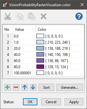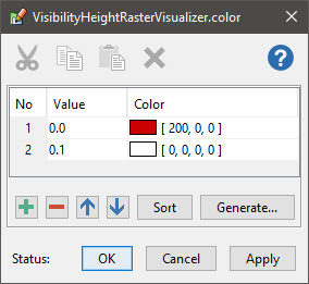 When custom propagation is used, the LOS raster values do not necessarily represent heights, but it can still be natural to display all values above some threshold as fully transparent, for example if the values indicate path loss in decibel. But there are counterexamples: the custom propagation sample calculates vision probability in percent from 0 to 100, so within the MaxDistance it is natural to display zero values as fully transparent, while the raster values beyond the MaxDistance will still be 15 000 000.0, and to make them fully transparent, too, your color table must be designed accordingly; for example: