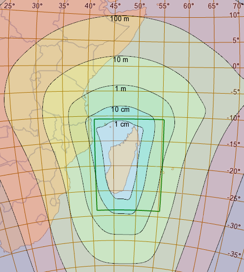 The roundtrip error is less than 1 cm on Madagascar itself, but increases rapidly offshore. The worst error in the Area of Use occurs in the southeast corner and is about 3 meters. We believe that it is the inverse direction (from projected coordinates back to LongLat) that is inaccurate.