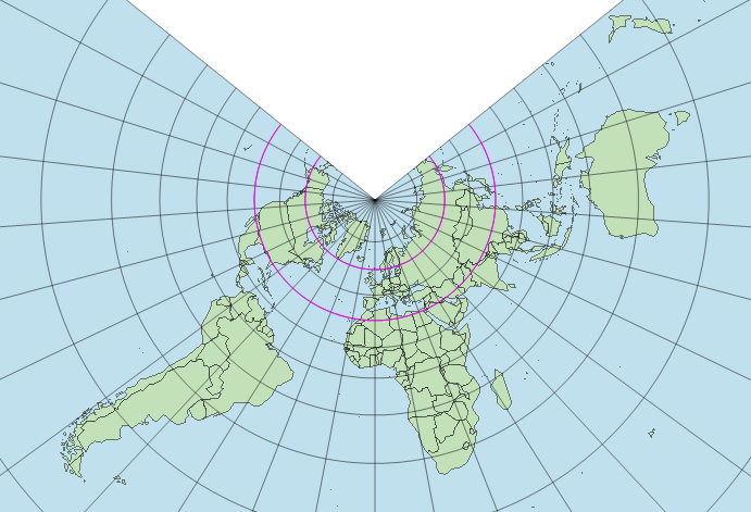 Johann Heinrich Lambert published his conformal conic map projection in 1772, but it was little used before the 1900s. It is conformal everywhere except at the poles. One pole will be shown as a point from which the meridians radiate as straight lines, equally spaced. But meridians that are 1° apart on Earth will be less than 1° apart in the projection. At the meridian that is antipodal to the centralLongitude, there will be an interruption: an unused sector of the map. The opposite pole is projected to a circle arc which is, in theory, infinitely far away. The projection is normally used for conformal mapping of areas that have larger extent west-east than north-south, like Russia. It is seldom used for very large scale maps, like city maps.
