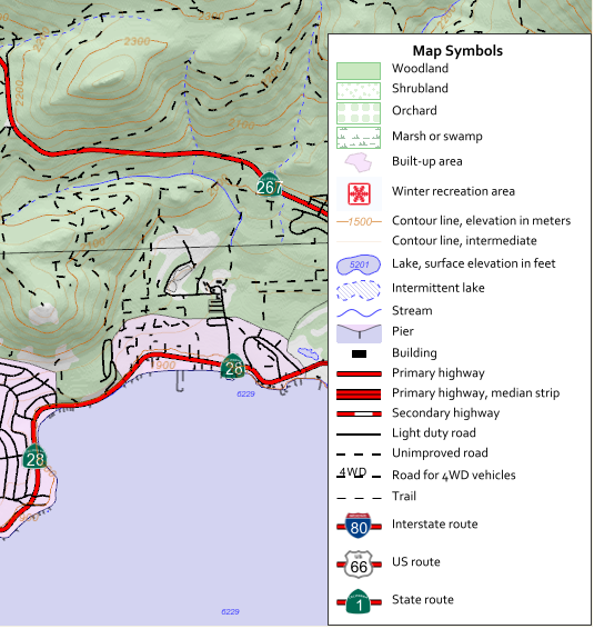 A legend is a key to the symbols used on a map. Each symbol is represented by a LegendItem, consisting of an image and a description. To be displayed in the map window, the legend items must be put in a Legend object that is used as a ScreenLayer element in a ScreenLayer that is attached to the View. A Legend object can also be attached directly to a view or to some non-screen layer that it describes, as documentation, but that will not make the legend appear in the map window. Instead, an application can access the items of such a legend and display them in a GUI panel distinct from the map window, or construct a PDF document, say. See LegendItem.GetImage. in Carmenta Explorer, for example, the legend items will appear in the Properties panel when a layer with a legend is selected in the Layers panel.