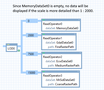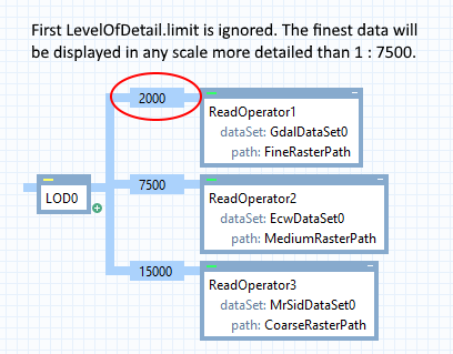 A LevelOfDetailOperator will ignore the given LevelOfDetail.Limit of its first LevelOfDetail, treating this limit as zero. This means that the data from the first LevelOfDetail will be displayed at the most detailed scales. To get a blank visualization at the most detailed scales, you can use a ReadOperator with an empty MemoryDataSet as in the second picture below. This method is of course applicable at other levels too, if you want a scale or resolution interval that does not visualize any data.
