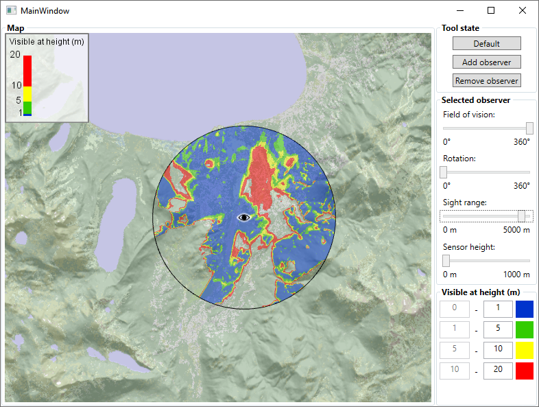 This sample, using C# and Windows Presentation Foundation, lets the user create one or more observers, and performs a line-of-sight calculation for each one. The user can adjust several of the line-of-sight parameters, or move the observers around, and the line of sight will be updated accordingly. The application also shows a legend explaining the colors of the line-of-sight visualization.