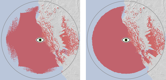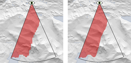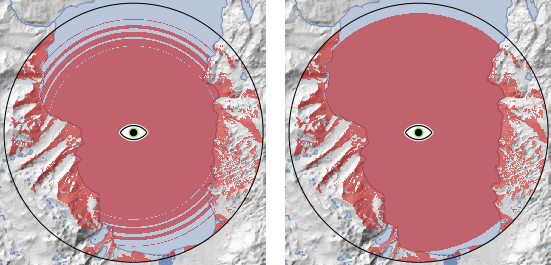 Over land, the inaccuracies caused by nearest-neighbor lookup are usually masked by irregularites in the elevations, but one can sometimes see a jagged viewshed boundary that would be smoother with an higher value for InterpolatedCells: