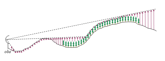AboveTreetops: then the output contains visibility heights above treetops. Use this option when the observer is looking for military aircraft that fly as low as possible to avoid radar. (In the picture, the arrows start from the treetops level, although they may appear to start from the ground in a foggy forest.)