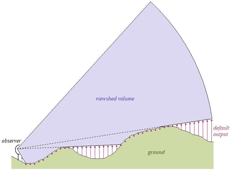 The positive infinity value can mean that an aircraft above the raster cell is invisible regardless of its altitude. So, this value will occur in the output rasters beyond the MaxDistance. Also, when the output is an 16-bit integer raster, the positive infinity can mean that a minimal height of visibility exists but is equal to or greater than 32 766 vertical units. Since few aircrafts can fly as high as 32 766 meters, this ambiguity is seldom important. Concrete representation: