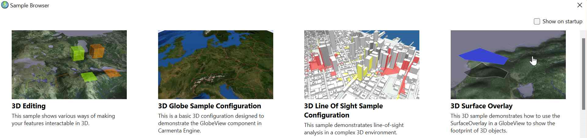 Multiple map configuration samples files are included in the Carmenta Engine SDK installation. These samples require an installation of the geographic data from the Carmenta Engine Samples Geodata installation package. After installing the data it is possible to browse the different map configuration samples in Carmenta Explorer. You can show the browser by File → Show Map Configuration Samples. By clicking on a sample, it will open up directly in Carmenta Explorer.