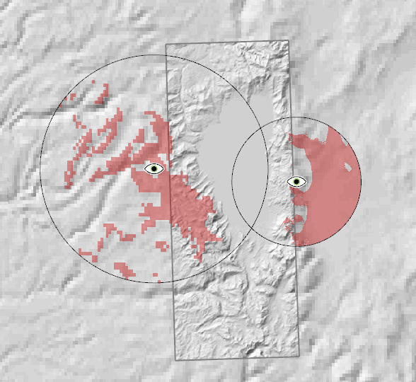 The line-of-sight operator will probe its elevation input to determine the highest available resolution near each the observer. It will then demand this basic resolution as far away as it needs, and will resample incoming data if necessary. (Farther away from the observer, the line-of-sight operator may demand elevation data in a series of lower resolutions, resampling the input again if necessary; see VisibilityOperator.FirstResolutionChange.) So, since the west observer is located where we only have coarse GMTED 2010 elevations, its entire viewshed is computed in this resolution. The east observer is located where we have 10 m elevation data, and the viewshed is computed in high resolution (well, actually in a series of resolutions of 10 m, 20 m, 40 m, etc., due to the VisibilityOperator.FirstResolutionChange). Note that the east part of the east viewshed is computed in elevations that have been upsampled from the coarser GMTED data. So, this part of the viewshed looks more accurate than it probably is.