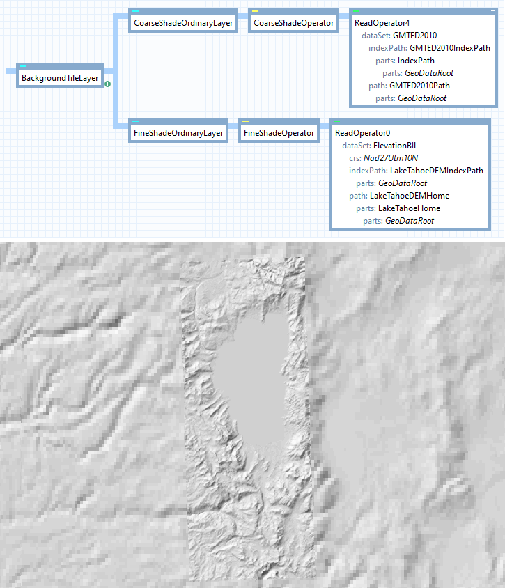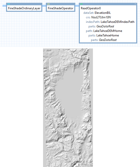 In a small area around the lake, we have a fine elevation raster with 10 m resolution, expressed in a Crs known as NAD27 / UTM zone 10 North. Around the boundary of the data, there are elevation cells with the undefined value, and the default visualization by a ShadeOperator will show these as if they were flat ground:
