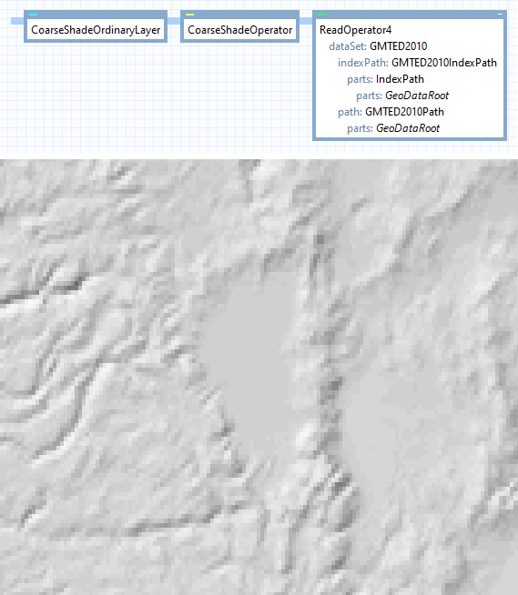 In a larger surrounding area, we have coarse GMTED 2010 elevations, expressed in Wgs84LongLat (resolution 30 * 30 arc seconds, or about 730 * 920 meters). We show them here with a NearestNeighbor filter on the ShadeOperator, to emphasize the difference in resolution. (They would look smoother with a Bilinear or Bicubic filter.)